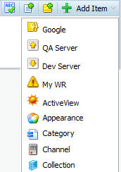 In diesem Beispiel werden die Objekte Google, QA Server, Dev Server und My WR den Positionen 1, 2, 3 und 4 des Menüs Objekt hinzufügen hinzugefügt. Bilder wurden über das Verzeichnis <support> definiert und die entsprechenden Verknüpfungen (zum Beispiel newURL) wurden angegeben. Dev Server verwendet die standardmäßige Erstellungs-URL für den Untertyp 12345. Alle standardmäßigen Menüobjekte werden ab Position 5 angezeigt. „My WR“ fügt ebenfalls die Option zu den Verknüpfungssymbolen neben dem Menü hinzu. Das Verknüpfungssymbol wird auf das Bild festgelegt, das durch newIconImg angegeben wurde, und wird auf der linken Seite der anderen Symbole hinzugefügt, da newIconOrder dem Wert 1 entspricht. Im folgenden Bild wird gezeigt, wie das Menü Objekt hinzufügen mit dieser Überschreibung aussieht.