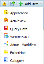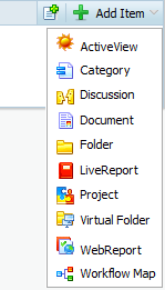 In diesem Beispiel wird das Objekt Erscheinungsbild an Position 1 in der Liste verschoben, und das Bild wird geändert. Das LiveReport-Objekt wurde in Abfragedaten umbenannt, hat dieses Objekt an Position 3 verschoben und eine URL bereitgestellt, die ausgeführt wird, wenn das Objekt ausgewählt wird. Das WebReport-Objekt wurde an Position 4 verschoben, umbenannt und sein Untertypwert wurde auf „30303“ festgelegt. Es wurde kein newURL-Argument angegeben, daher wird die standardmäßige Erstellungs-URL für den Untertyp 30303 verwendet. Das Workflow-Diagramm-Objekt wurde an Position 5 verschoben, mithilfe eines WebReport-Tags umbenannt, um den Benutzernamen anzuzeigen, und einer URL zur Ausführung bei der Auswahl. Der Befehl zum Ändern des Ordner-Objekts verwendet die Attribute scope, newIconImg und newIconOrder. Durch diese Änderung wird das Menüobjekt in „FolderMod“ umbenannt. Zudem wird der alternative Text des Verknüpfungssymbols in „FolderMod hinzufügen“ umbenannt. Ferner werden dadurch das Bild und die Reihenfolge des Verknüpfungssymbols geändert, sodass es links neben dem Symbol Dokument hinzufügen angezeigt wird. Im folgenden Bild wird das geänderte Menü Objekt hinzufügen veranschaulicht.